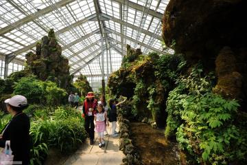 아기자기했던 우리꽃 전시관 다음에는 유리창들이 반짝이는 우리꽃 사계절관이 이어진다. 한국 최초의 전통한옥 형태의 유리온실을 직접 보니 선이 참 곱다. 높이도 22m나 되어서 크고 아름답다는 말이 절로 나온다. 우리꽃 전시관 내부는 작은 숲에 온 것 같이 잘 꾸며져 있어서 어른들은 물론 아이들과 함께 오면 더할 나위 없이 좋다. 높은 유리온실 천장에 닿을 듯이 세워져 있는 거대 바위산은 그 위용에 입이 쩍 벌어진다. 한반도 5대 명산인 백수단, 한라산, 지리산, 설악산, 태백산을 바위로 표현했고 그 안에 군락을 이루는 식물들을 연출하여 우리 꽃의 사계절을 감상할 수 있게 만들었다. 그 안을 자세히 살펴보면 자그마한 우리 꽃들이 날 좀 보라는 듯이 얼굴을 내밀고 있으며, 깨알같이 자리 잡은 동물들을 찾는 재미도 쏠쏠하다. 작은 꽃들과 큰 나무들이 모두 어울리며 조화를 이루고 있는 모습을 보니 심신이 편안해짐을 느낀다.