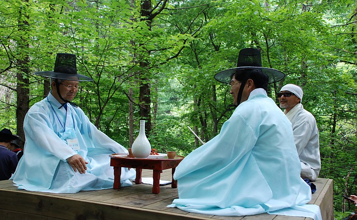 죽령옛길걷기에서 농암과 퇴계의 작별을 그려내는 역할극의 모습. 주막촌이 활성화되어있던 당시의 모습을 보여준다.
