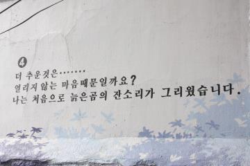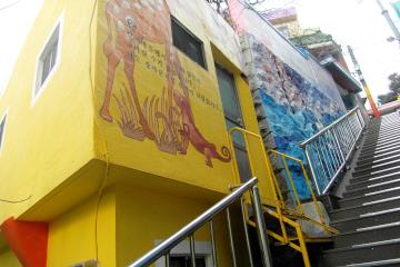 책방 골목을 구경하다 보면 높게 솟아 있는 계단이 나온다. 언덕을 오르는 계단을 올라가면 벽화 마을이다. 마을 벽이 동화책이다. 동화 속 나라에 들어온 것만 같다. 파스텔 톤에 알록달록 색감이 아름답다. 카멜레온 이야기가 쓰여 있다. 번호대로 문구를 읽는다. 형형색색에 벽화와 잘 어울리는 이야기다.