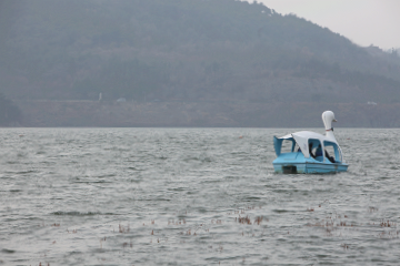 보문호 한 가운데 오리배가 떠다니고 있다.