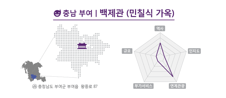• 민칠식 가옥은 중부권 역사 관광지의 대표적 명소인 부여 낙화암 등과 연계 관광하기 적절하다.