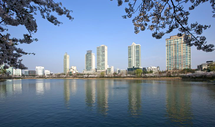 석촌호수의 하늘빛은 사계절 아름답지만, 벚꽃이 화사하게 피어나는 봄철 가장 예쁘다.