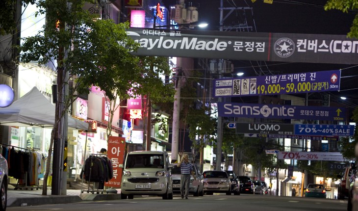 문정동 로데오거리의 밤은 반짝반짝 네온사인으로 화려하게 빛난다.