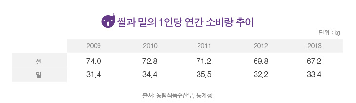 쌀 소비량은 꾸준히 감소하고 있는 반면, 밀 소비량은 점진적으로 증가하고 있다.