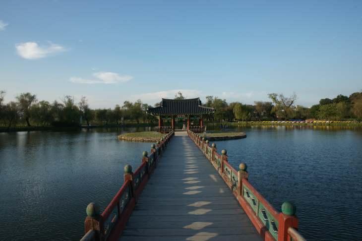 '포룡정'으로 이어진 다리가 궁남지와 어우러져 운치를 더하고 있다.