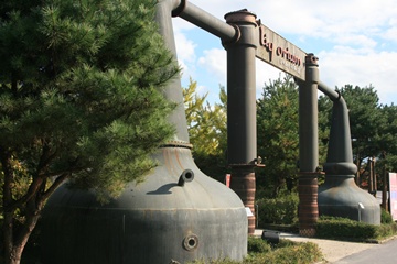 충주 세계 술 문화 박물관 입구, 스코틀랜드에서 온 증류기가 압도적인 크기를 자랑한다.