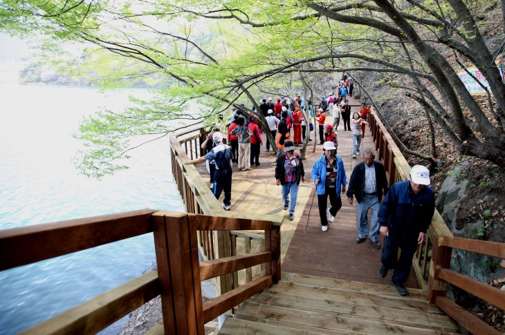 산막이옛길을 걷는 사람들. 나무 데크 길 뒤로 괴산호의 수려한 풍경이 펼쳐진다.