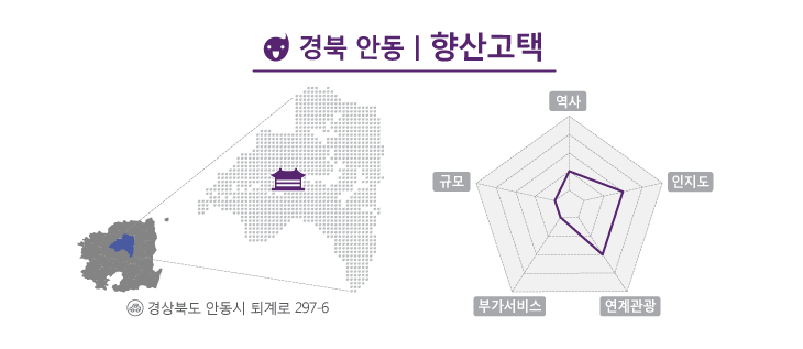 안동 향산고택은 '삼대 독립운동 가문'으로 지정된 고택으로서, 인근 관광지 월영교와 가까워(3km) 함께 둘러보면 좋다.