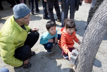 미산마을에서 아이들이 직접 고로쇠 수액을 받고 있다.2