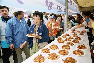 초장과 야채, 멸치회를 버무려 만든 별미 회무침. 시식을 앞둔 이들의 표정이 밝다.2