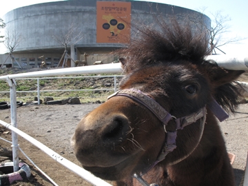조랑말체험공원에서는 제주말을 만날 수 있다. 뒤로 보이는 건물이 조랑말박물관
