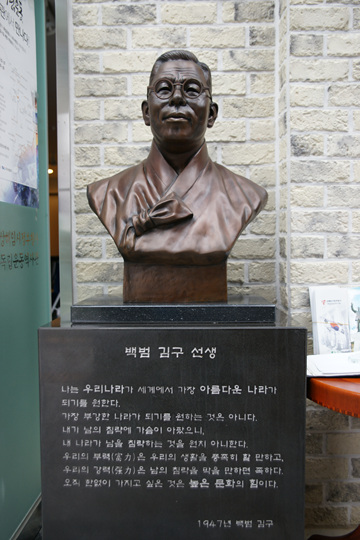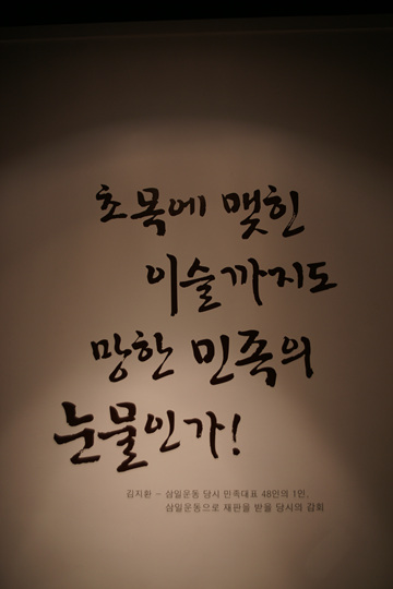 전시관 내부에 세워져 있는 김구 선생의 동상(좌)과 벽면에 쓰여 있는 김지환의 감회(우).동상을 지나 청사 1층 내부로 들어선다. 내부에 들어서니 이번엔 전시실 한쪽에 세워진 백범 김구 선생의 동상이 눈에 들어온다. 동상 아래로는 생전 고인이 한 말이라 전해지는 ‘나는 우리나라가 세계에서 가장 아름다운 나라가 되기를 원한다…’라는 글귀가 보인다. 다른 쪽 벽면에는 민족대표 중 하나였던 김지환이 한 말이 새겨져 있다. 전시관 곳곳에 새겨진 글귀에서 나라를 진심으로 아끼고 사랑했던 민족대표들의 마음이 느껴진다.