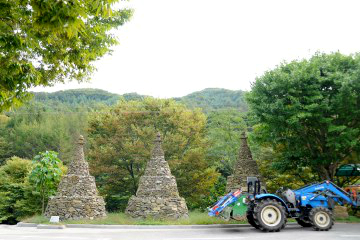 부곡천탑마을 입구에 세워진 커다란 돌탑 세 개와 정자 하나.