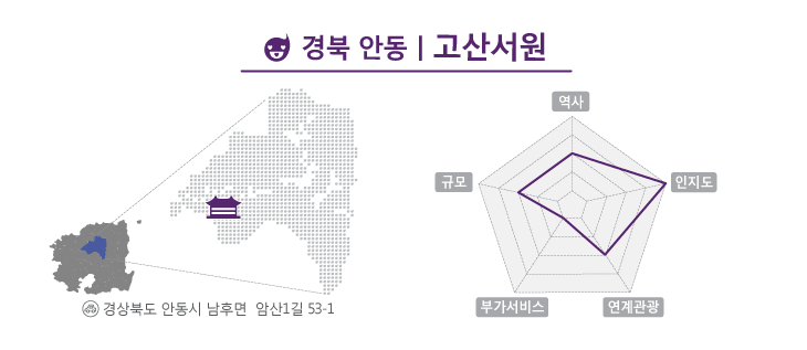 삼삼오오 모여 학식을 논하던 앳된 선비들의 걸음걸이가 흔적으로 남은 고산서원은 정조 13년(1789) 대산 이상정의 학문과 덕행을 추모하기 위해 지방 사림이 건립되었다. 선현 배향은 물론 지방 교육도 함께 담당하였으며 1985년 10월 경상북도기념물 제56호로 지정되었다.