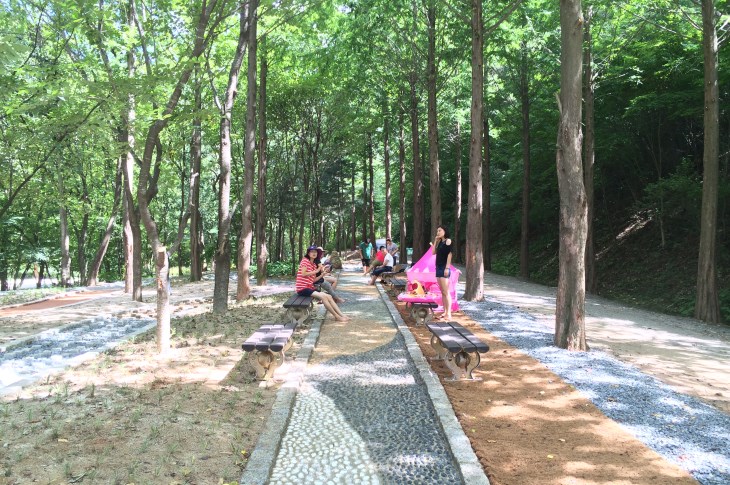 상소동산림욕장 전경. 산림욕장을 찾은 사람들이 지압길에서 휴식을 취하고 있다.