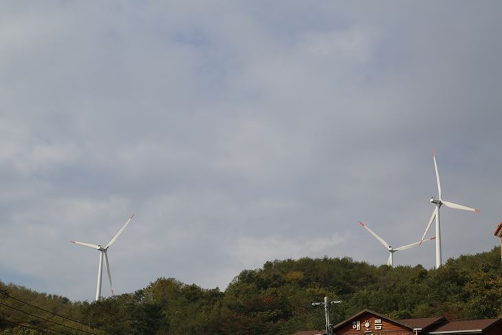 영덕군 블루로드 길 중 고불봉 산길을 따라 내려오면 풍력발전단지와 영덕군 경관이 어우러진 모습을 볼 수 있다.