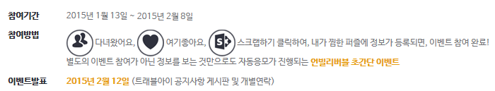 안녕하세요! 대한민국을 들썩들썩 트래블아이입니다 :) 새해맞이 세운 계획들은 잘 실천하고 계신가요? 힐링 그리고 일상탈출을 위한 베스트는 단연 여행인데요~ 여러분의 “to do list” check!를 트래블아이가 해결해드립니다! 트래블아이는 오는 3월 트래블피플과 함께 떠날 팸투어를 준비하며 들썩들썩 중인데요, 아쉽게 오픈이벤트에 참여하지 못한 분들, 팸투어를 떠나기 위한 포인트가 없으신 분들을 위해 초특급 이벤트! 회원가입만 하면 끝! 어때요, 정말 쉽죠? 참여하신 분들 중 선착순 10,000분께 각 10,000점을 자동 적립해 드립니다. 초간단 대박이벤트! 혼자 알고 계시지 마시고 주변 친구들에게도 널리널리 소개해주세요. 아직 트래블아이를 모르는 친구라면 더더욱 best! ▶이벤트 기간 : 2015. 1. 15~ 선착순 10,000명 ▶포인트 지급 : 회원가입하면 자동지급, 마이페이지 확인! 이미 트래블피플이라고요? 그래도 best! ▶이벤트 기간 전 회원가입하신 모든 분들께도 10,000점 지급 완료! ▶마이페이지를 반드시 확인하세요~ 쉿! 추가 2,000점을 받을 수 있는 찬스가 이벤트 2에 숨어 있으니 절대 놓치지 마세요!! 이벤트 바로가기>> http://www.traveli.co.kr/OneHMEvent닫기 |