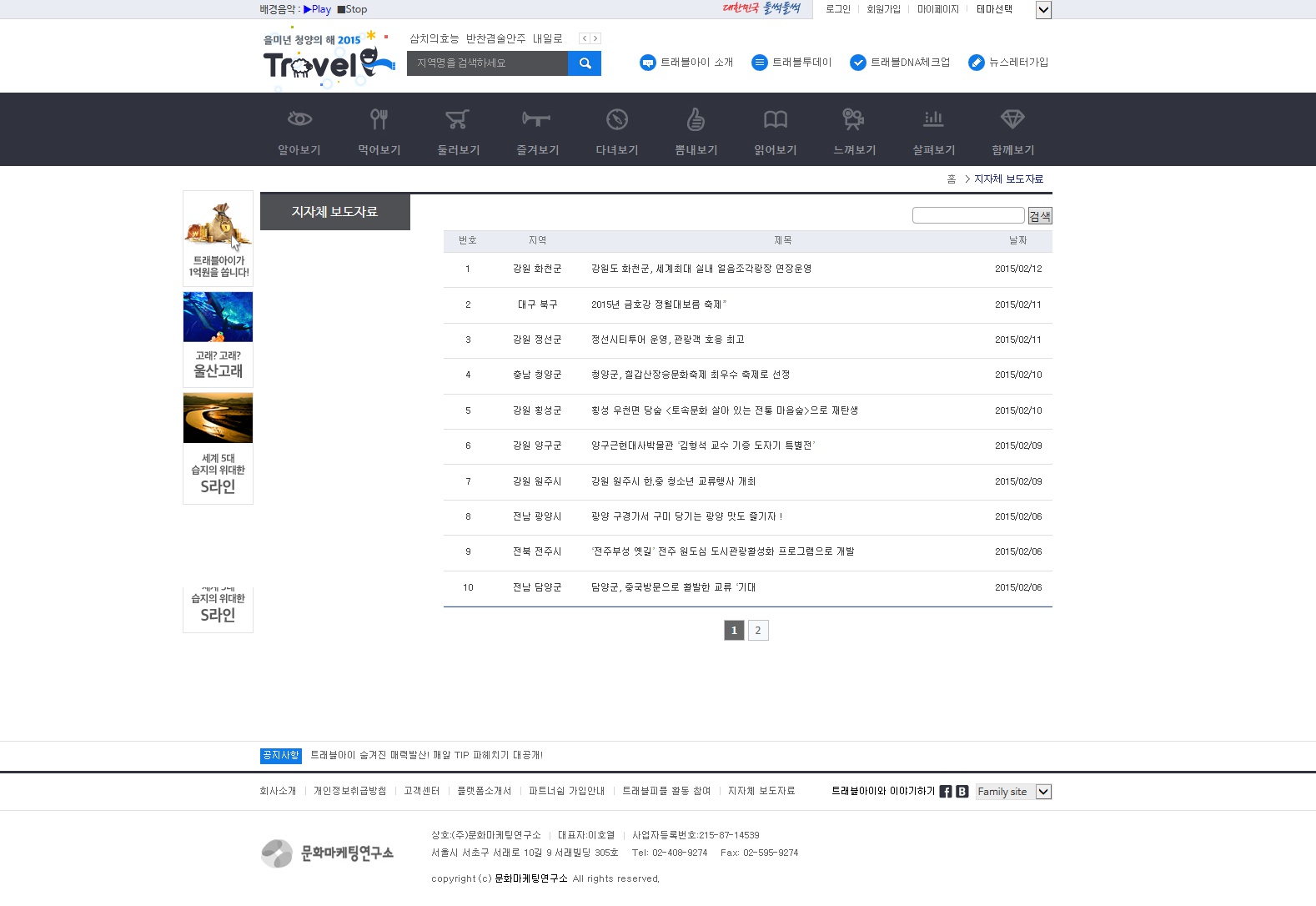 안녕하세요! 대한민국을 들썩들썩 트래블아이입니다 :) 첫번째! 지자체 보도자료 바로가기>> http://www.traveli.co.kr/areaNews/list/fnews |