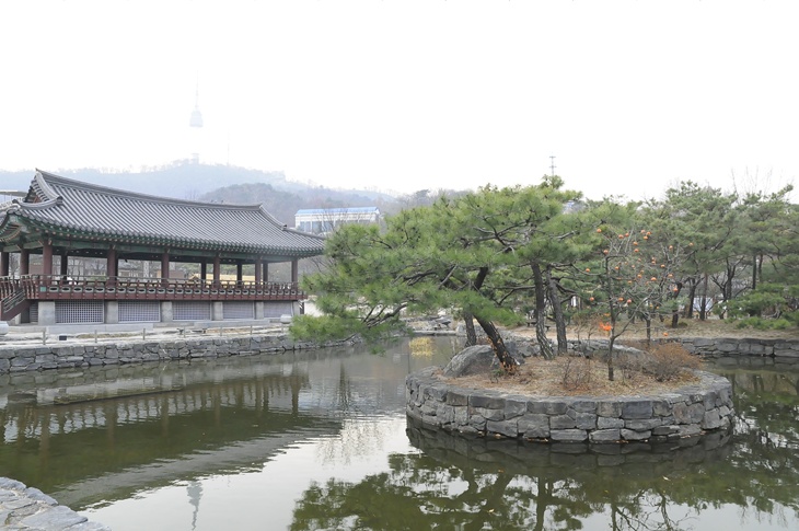 남산골 한옥마을 입구에 들어서면 푸른 연못과 천우각을 만난다.