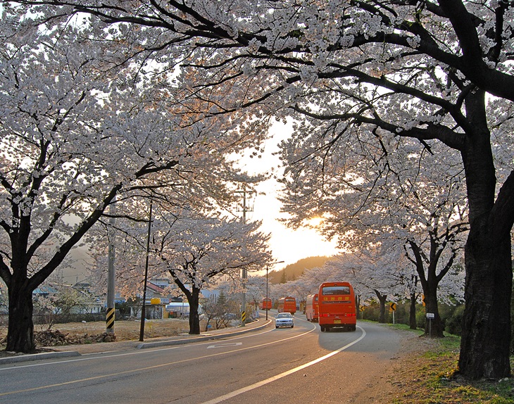 둥근 호수길을 따라 벚꽃에 취해봤다면 이번에는 양쪽에서 인사하듯 떨어지는 벚꽃을 만날 수 있는 벚꽃 터널을 소개한다. 속초 시내에서 설악산 국립공원으로 가는 길, 목우재 삼거리 근처가 바로 그것. 장성한 벚나무들이 크기로 그 수령을 증명하고 알차게 꽃을 피운다. 길을 따라 하늘이 보이지 않을 만큼 꽃이 꽉 들어차서 과연 벚꽃 터널이라고 불릴 만한 곳이다. 벚꽃 놀이 명소답게 오색 조명이 설치돼있어 밤에도 꽃을 보기 좋다. 밤 벚꽃은 알다시피 또 새로운 세계를 선사하기 때문에 낮에 이어 또 한 번 구경하는 것도 좋을 듯싶다.
